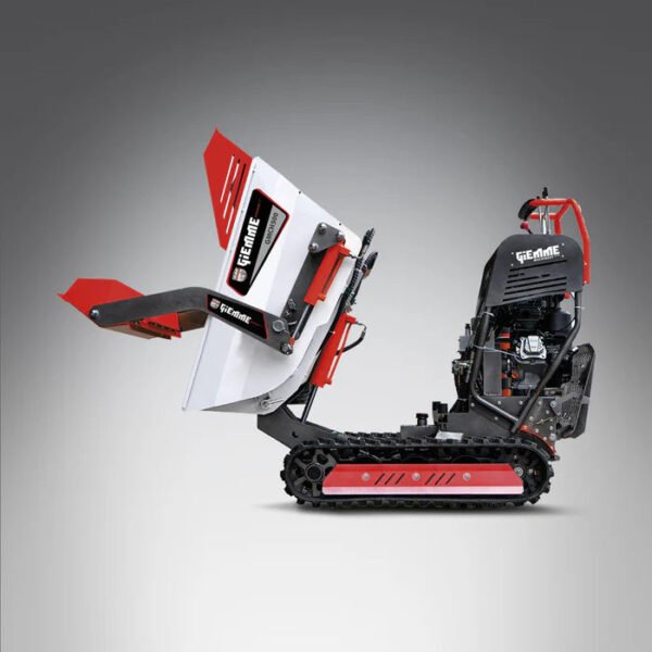 Les modèles GMCH 500 appartiennent à la catégorie des brouettes motorisées à chenilles dotées d’une transmission hydrostatique et d’une benne dumper à basculement hydraulique. Le basculement est commandé par un levier dédié positionné sur la console de commande. L’ensemble s’appuie sur une pompe hydraulique haut rendement, judicieusement dimensionnée par rapport à la charge utile, et sur un vérin robuste équipé d’une valve de blocage anti-chute : en cas de perte de pression soudaine du circuit, cette valve immobilise la benne, garantissant un niveau élevé de sécurité.